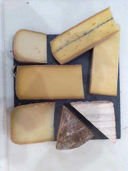 Assortiment de 7 fromages dont Saint Nectaire fermier (230g environ), brebis fermier Ossau (190g environ), Cantal Entre-Deux (240g environ), Morbier fermier (180g environ), Comté 18 mois fruité (240g environ), fromage breton fermier (170g environ) de la ferme de Lintan, 1/2 grand Pont-L’Évêque fermier