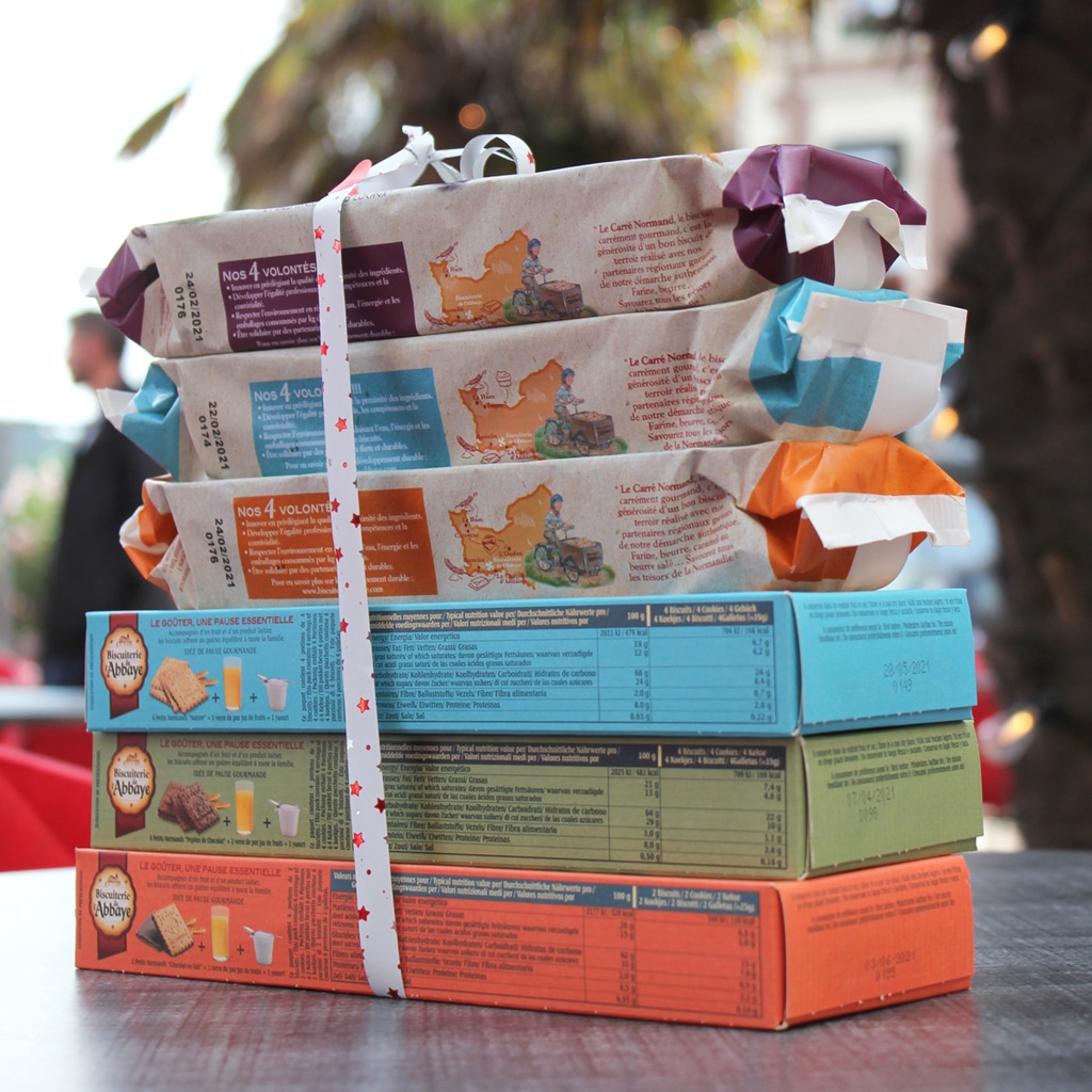 Assortiment de 6 boîtes de gâteaux de la Biscuiterie de l’Abbaye : Le Carré Normand : chocolat Le Carré Normand : vanille Bourbon Le Carré Normand : caramel beurre salé Le Petit Normand : chocolat au lait Le Petit Normand : nature