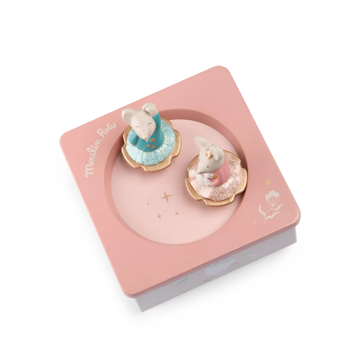 Boite à musique illustrée où 2 petites souris dansent au son d’une douce mélodie pour bercer et endormir bébé. Les plus grands prendront plaisir à actionner eux-mêmes le mécanisme sous la boîte pour voir danser les figurines en résine.