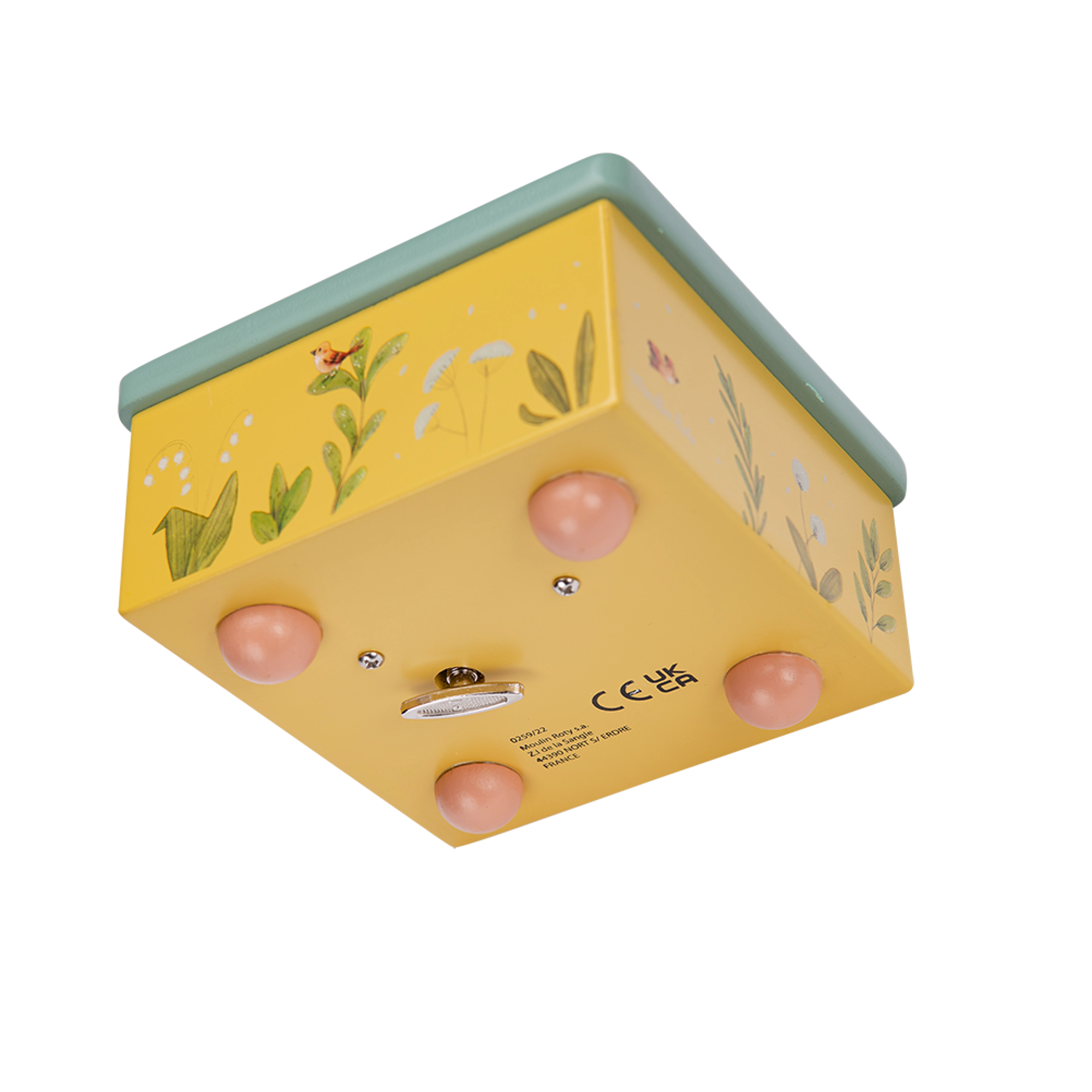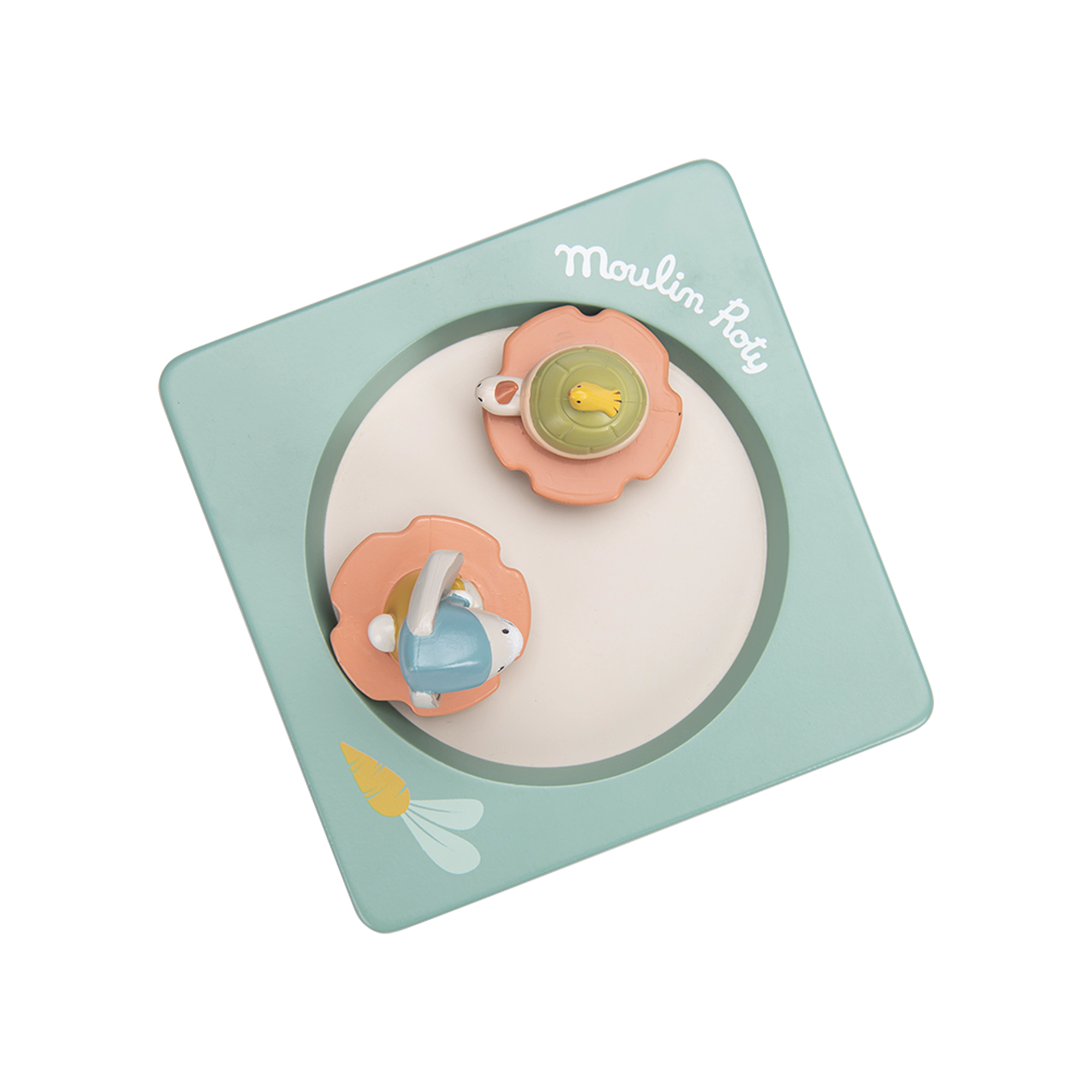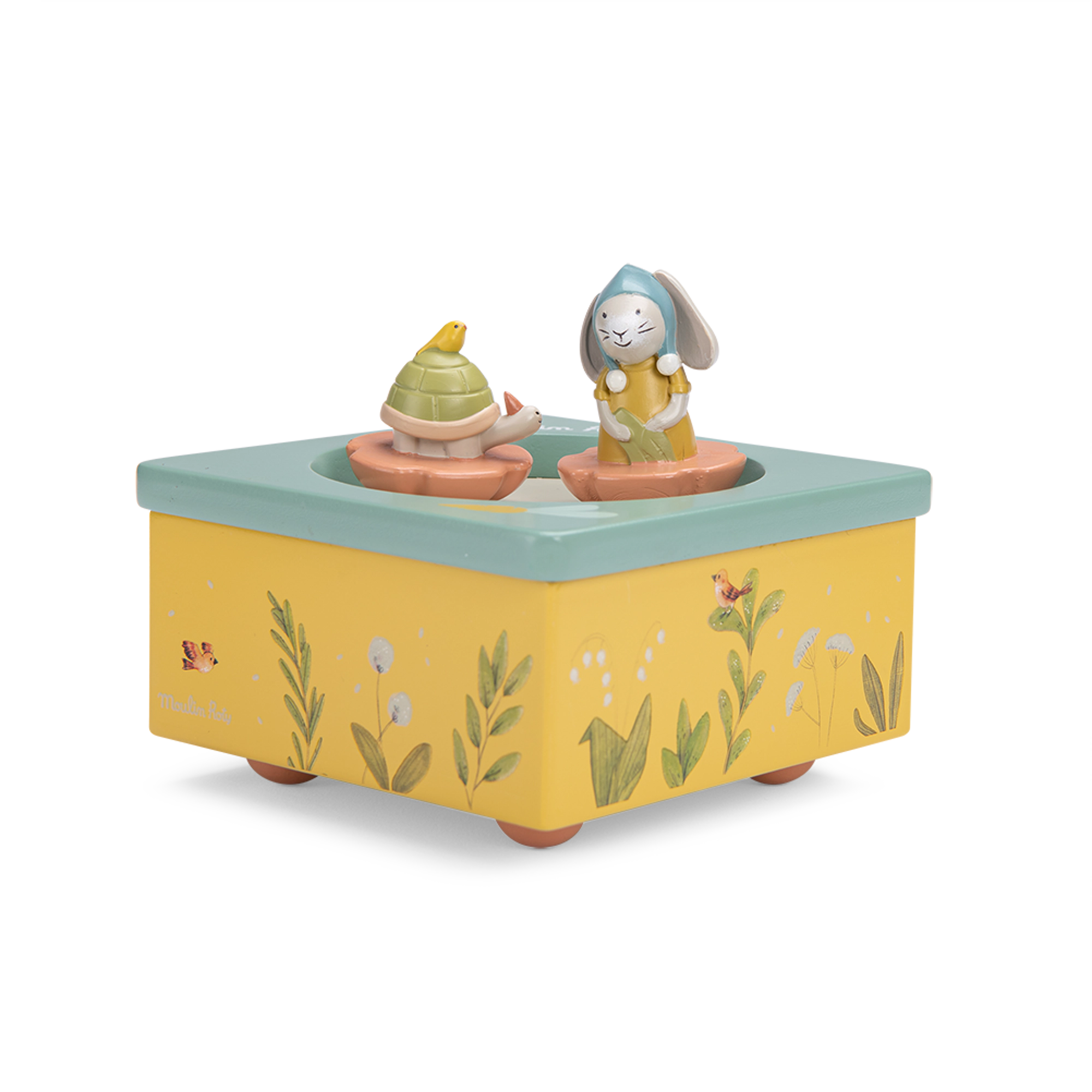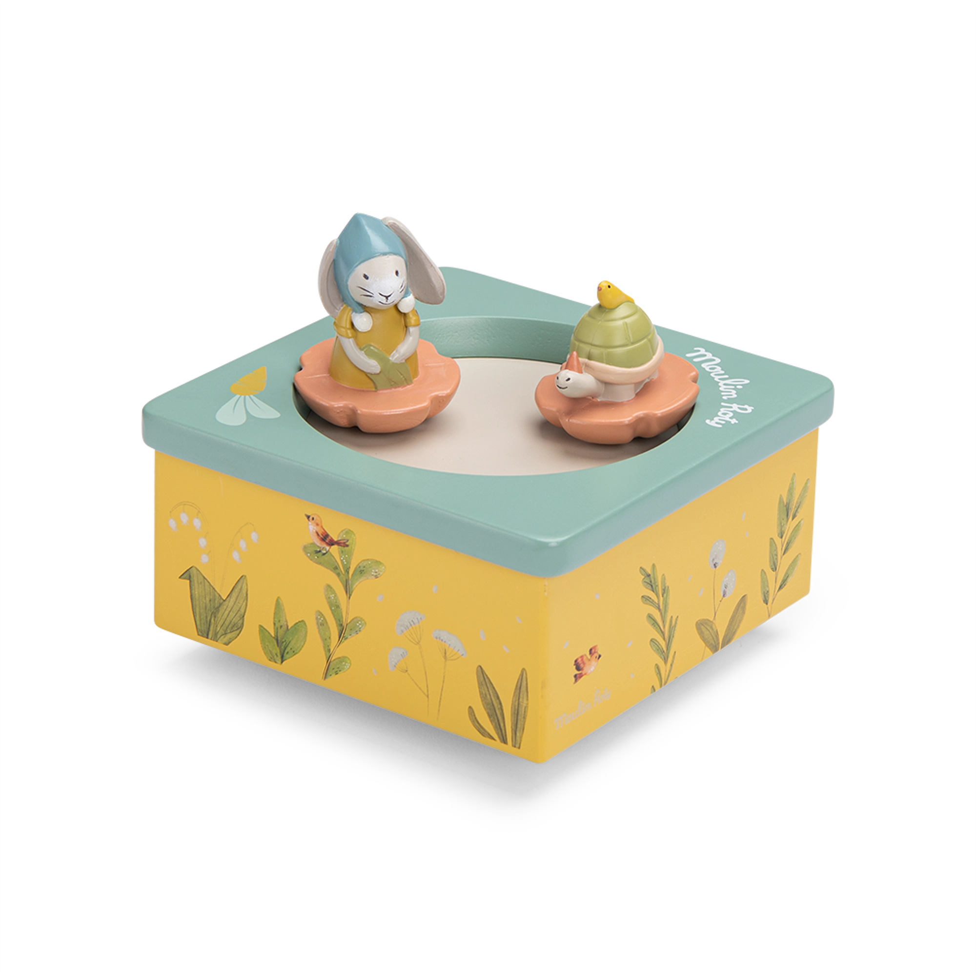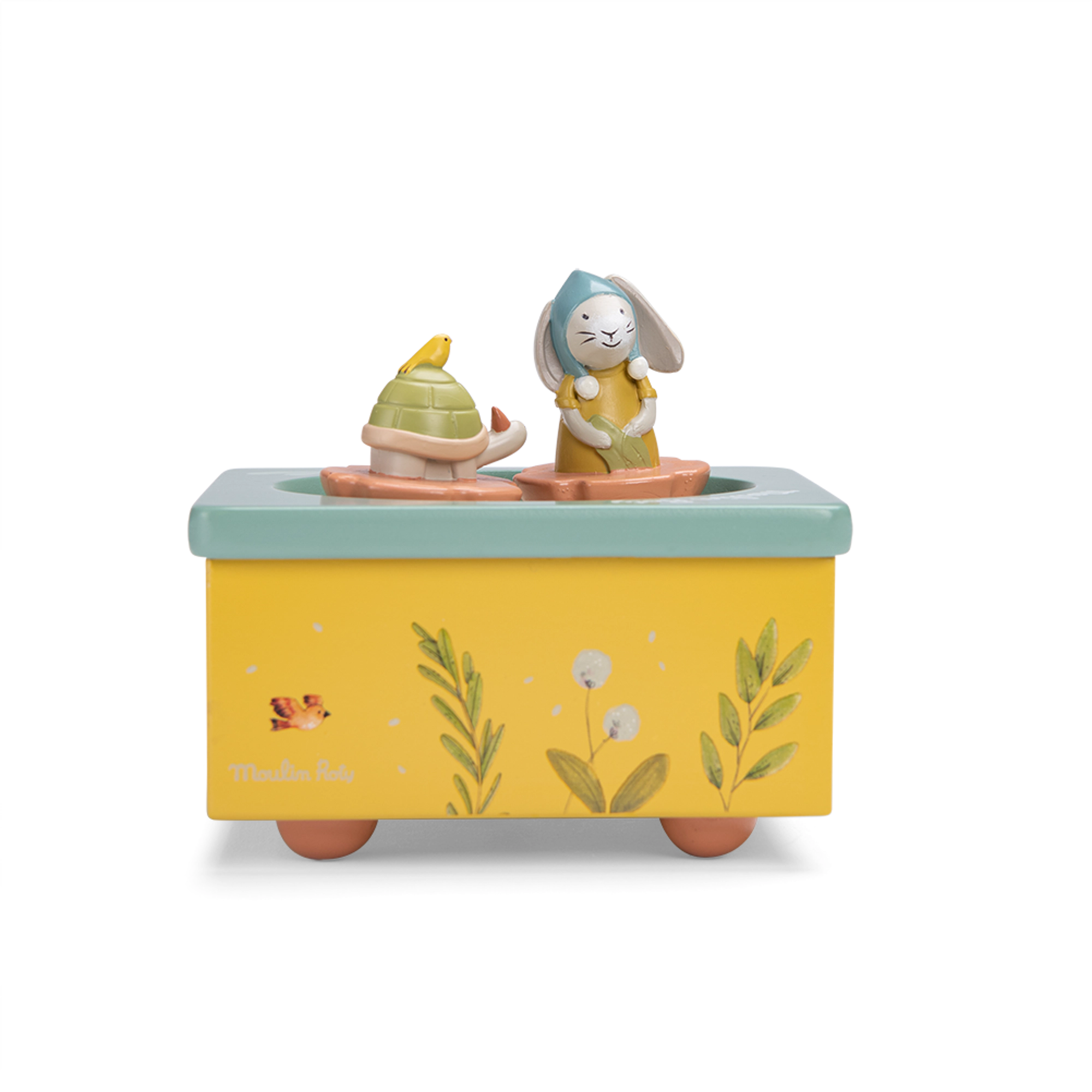 Découvrez la boîte à musique de la collection Trois Petits Lapins de Moulin Roty, une magnifique boîte à musique sur le thème du jardin, illustrée d’un joyeux paysage composé de plantes, de légumes et de petits oiseaux du jardin. Lapin et tortue tournent et dansent sur la piste pour bercer et endormir bébé. Remontez le mécanisme situé sous la boite et regardez les figurines valser au rythme de la mélodie. Un très bel objet de décoration pour la chambre de bébé et un adorable cadeau de naissance.