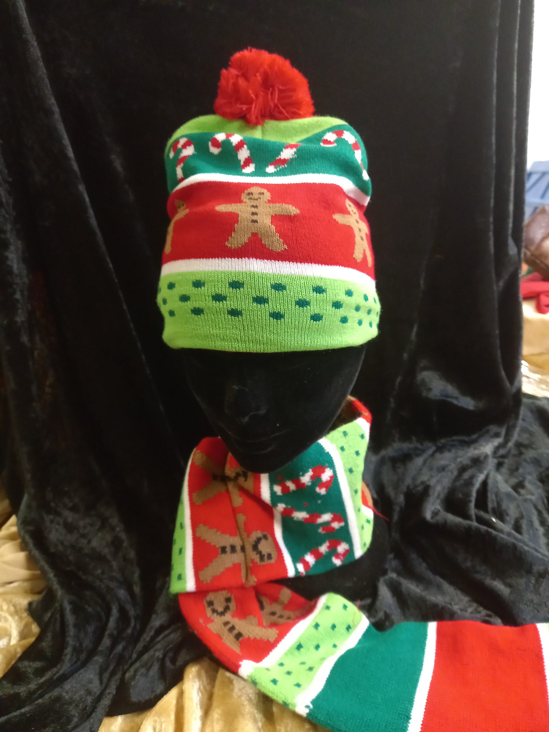 Véritable bonnet et écharpe aux couleurs et motifs de Noël, pour vous tenir chaud.