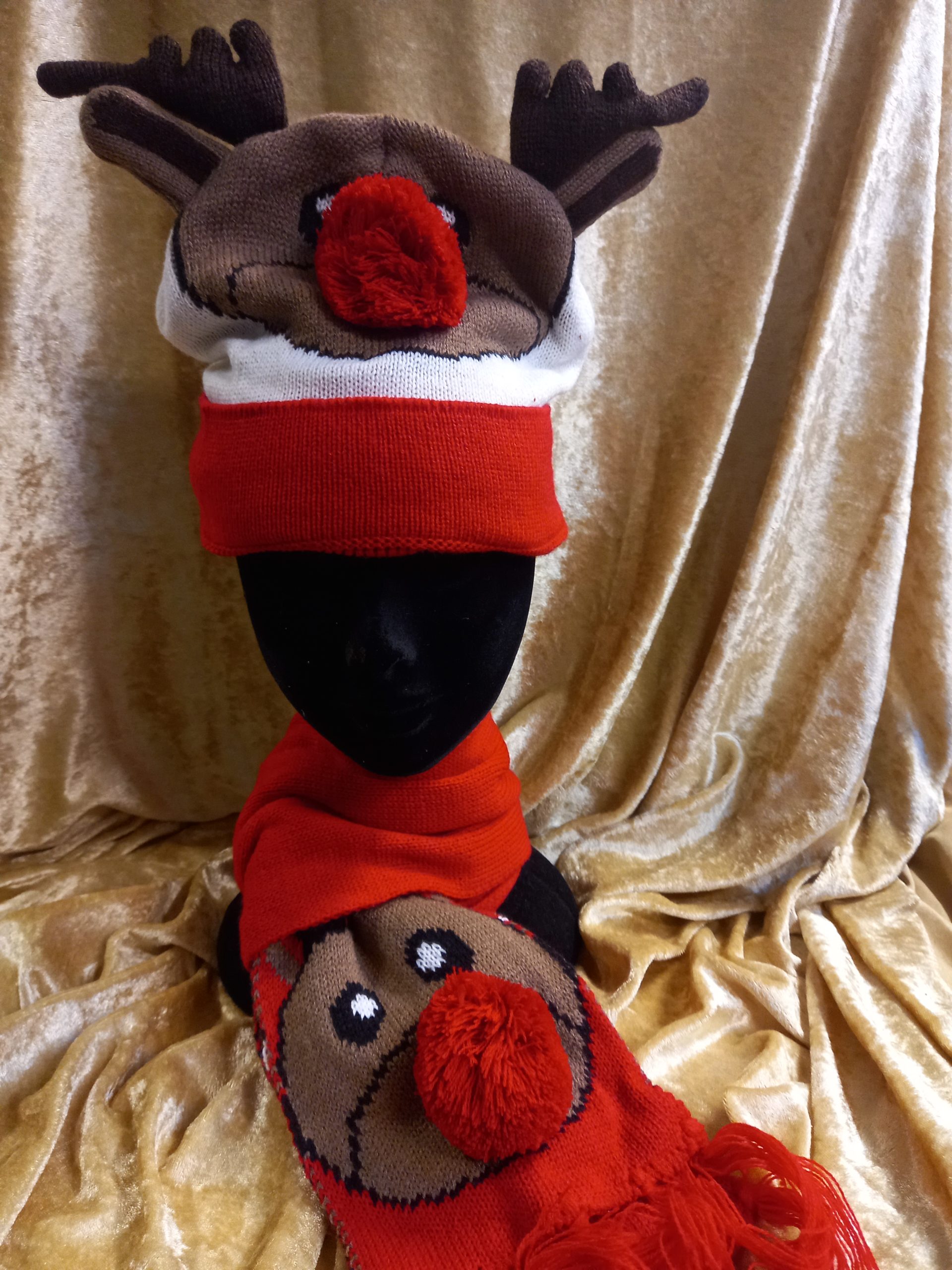 Véritable bonnet et écharpe aux couleurs et motifs de Noël, pour vous tenir chaud, sans oublier le nez rouge de Rudolph.