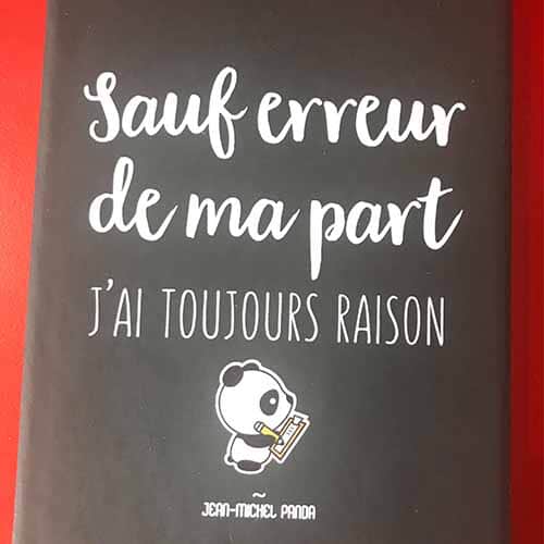 différents choix : – Sauf erreur de ma part j’ai toujours raison -arrêtons de prendre les cons pour des gens – hier j’ai rien fait et ça m’a pris toute la journée – je fais rien mais je le fais bien – je suis pile en retard – ne remets pas à demain ce que tu peux faire après demain -p’tit cul