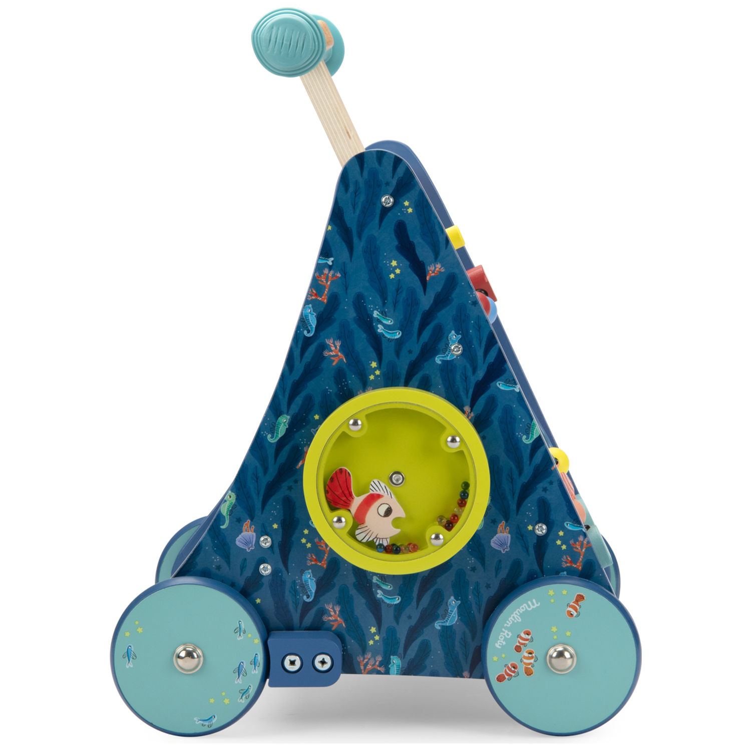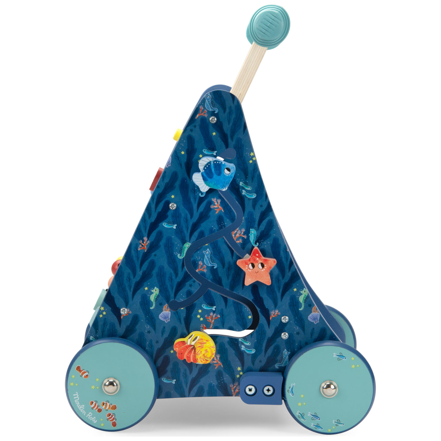 Découvrez le Chariot de marche d’activités de la collection Les aventures de Paulie de Moulin Roty, un superbe jouet d’éveil à la marche pour les enfants à partir de 1 an. Un chariot de marche antidérapant pour accompagner les premiers pas de bébé en toute sécurité avec poignées réglables en hauteur. Habillé aux couleurs des aventures de Paulie, ce chariot d’activités antidérapant accompagnera bébé dans ses premiers pas. Il propose 6 activités : labyrinthe, engrenages, miroir… Tout pour explorer les fonds marins en s’amusant ! Un magnifique jouet en bois à offrir en cadeau pour les filles et les garçons.