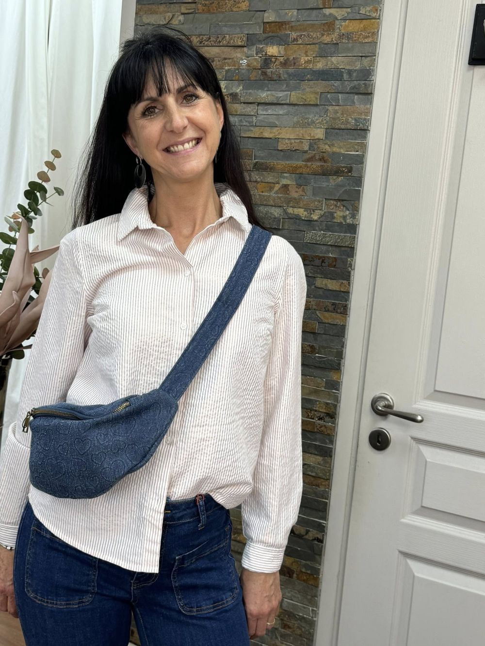 Chemise coupe droite, rayures verticales rose irisé.