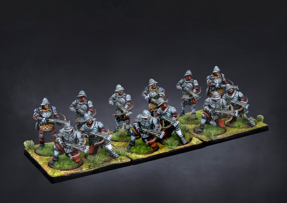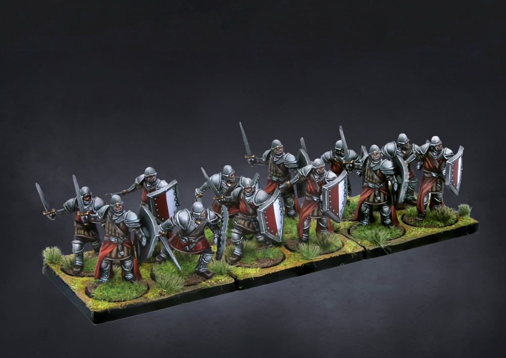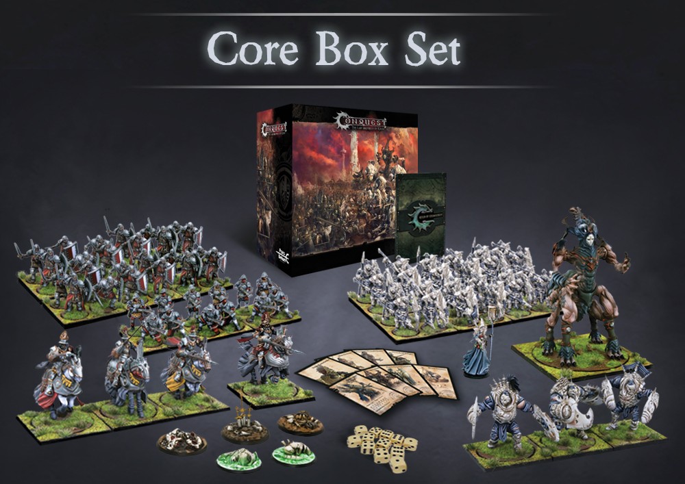 Contenue de la boîte : 1 Livre de règles 28 Cartes de commandement 12 Dès 6 Pions objectifs Les Cent Royaumes : 1 Noble monté 24 Hommes d’armes 12 Arbalétriers 3 Chevaliers de maisonnée Les Spires 1 Pheromancien 24 Clones 3 Drones Brutaux 1 Abomination Les figurines nécessite d’être monté et peinte.