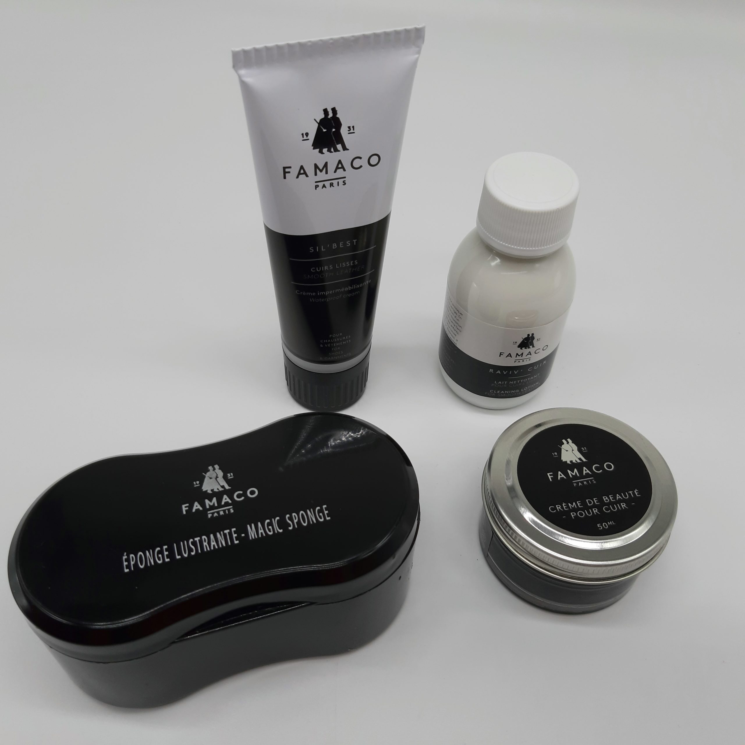 | produit | éponge, pot, raviv cuir, tube |