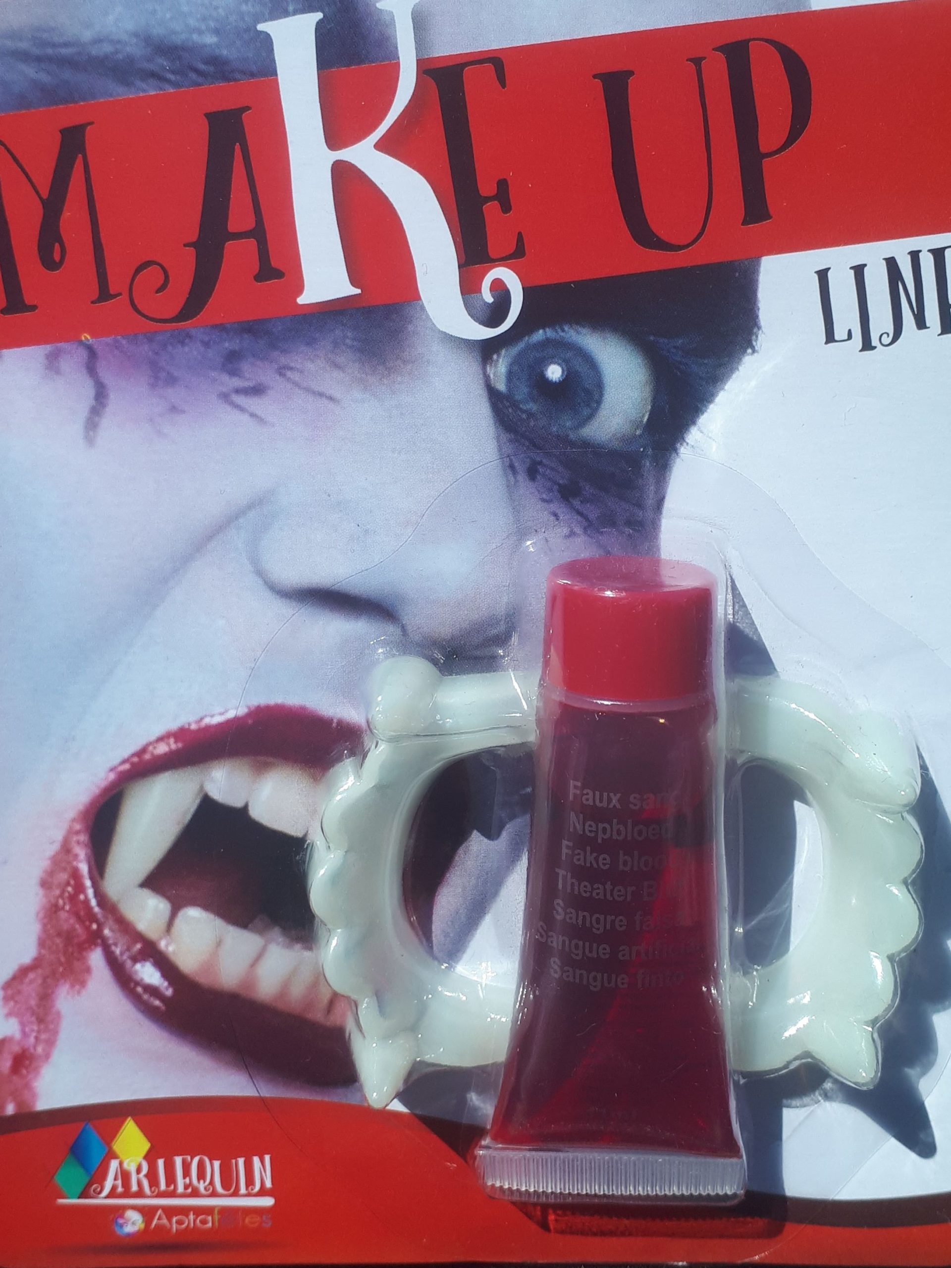 Tube de faux sang en gel – 11ml – avec dentier de vampire en plastique.