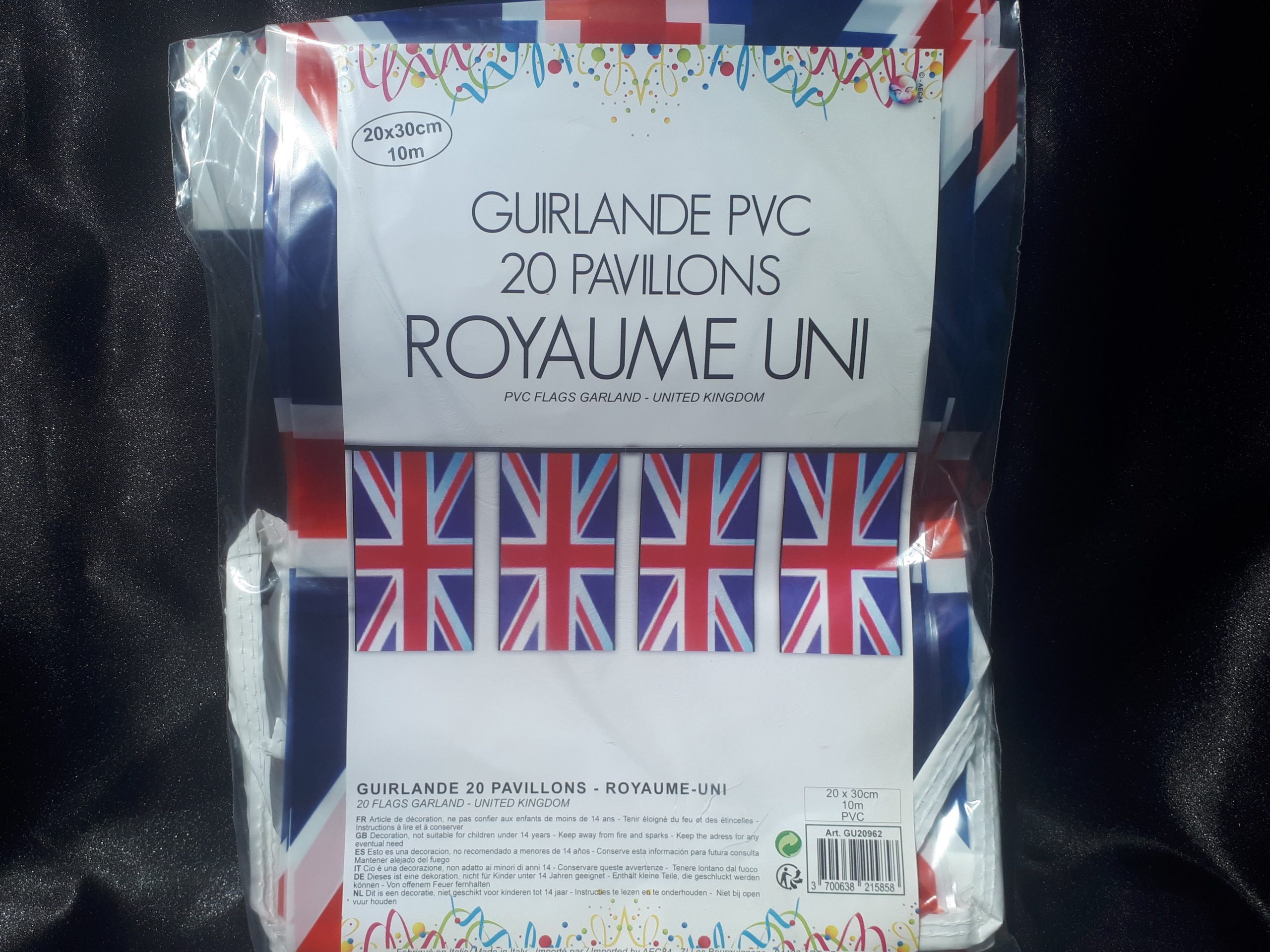 Guirlande Royaume-Uni de 10m, comprenant 20 pavillons de 20×30 cm. En PVC, idéal pour les décorations extérieures.