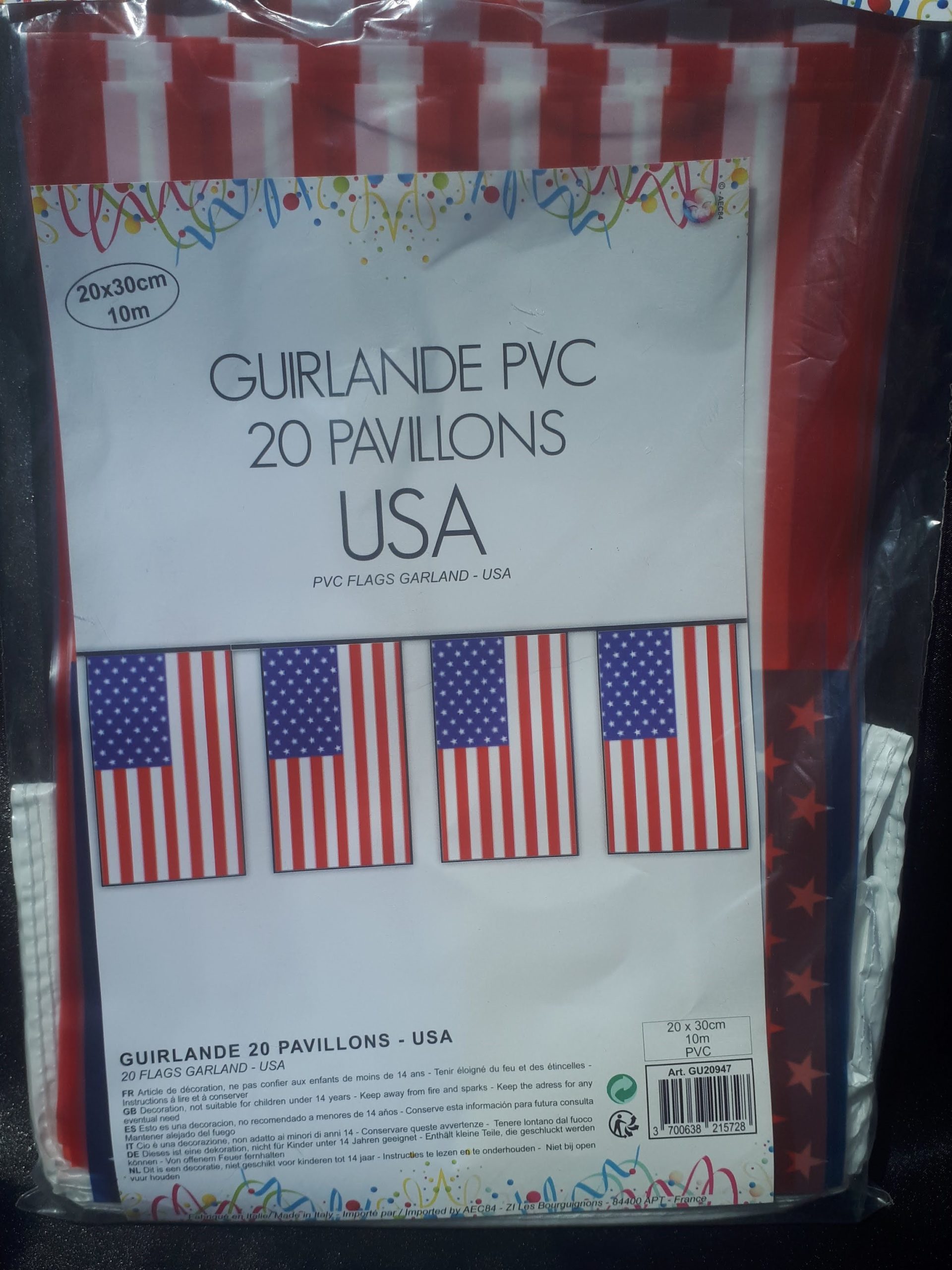 Guirlande USA de 10m, comprenant 20 pavillons de 20×30 cm. En PVC, idéal pour les décorations extérieures.
