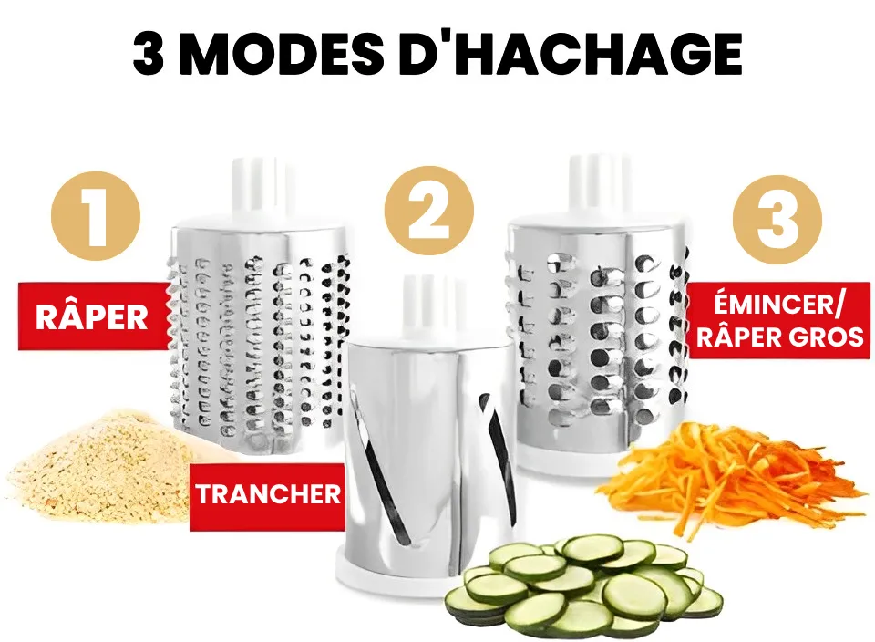 • 3 cylindres de tailles différentes (raper, émincer et trancher)