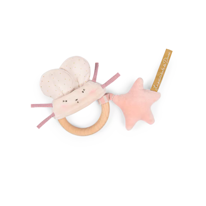 Hochet bois souris, accompagné de son étoile qui émet un joli son de grelot. Anneau en bois naturel, papier bruissant dans les oreilles, nouettes en forme de moustaches… de quoi éveiller la curiosité de bébé! Facile à saisir par les petites mains.