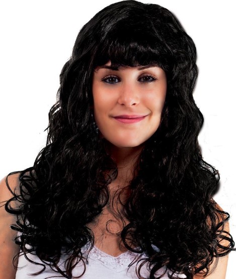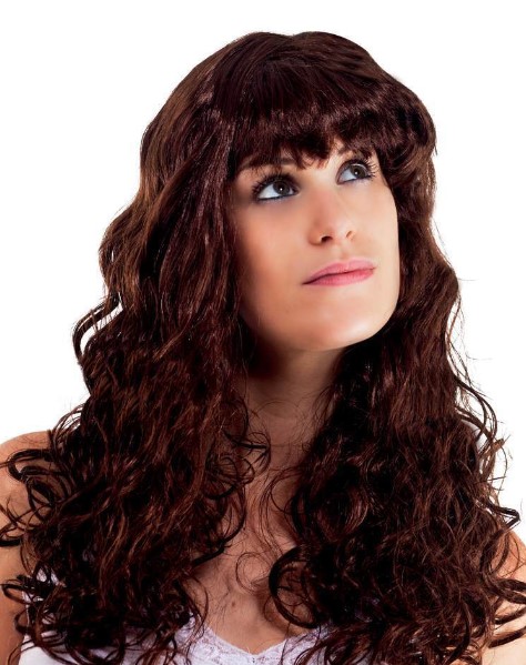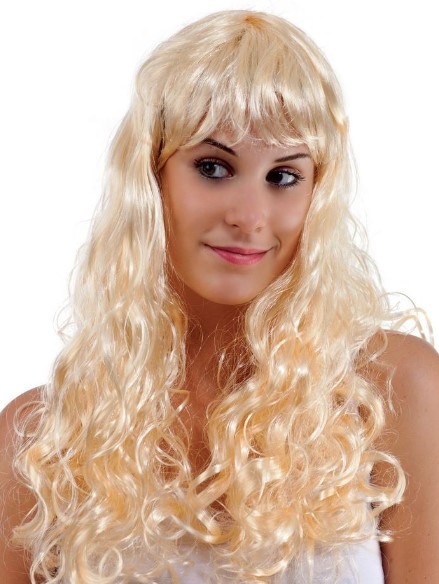 Perruque longue, frisée, avec frange. Existe en trois couleurs.