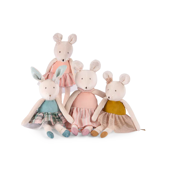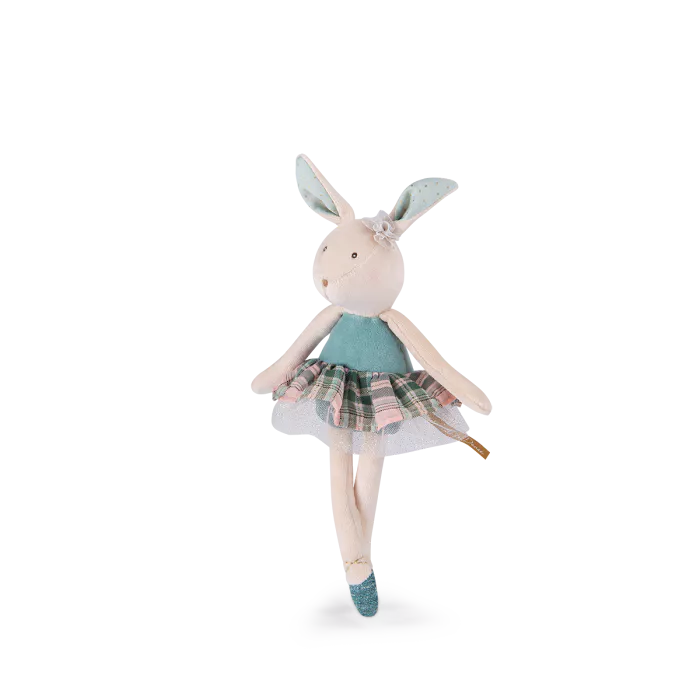 Poupée lapin en velours, au doux visage brodé. Joues poudrées, jupe tutu à carreaux, petit nœud sur la tête et ballerines nouées, elle est d’une grande élégance. Facile à attraper par les petites mains, elle deviendra le compagnon privilégié de bébé.