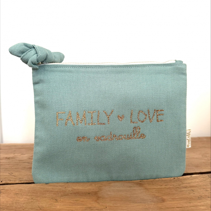 Family Love en Vadrouille “. 100% coton 320 g/m2 , entièrement doublée coton écru Fermeture éclair or et son petit noeud en tissu attaché à la tirette. Imprimé or pailleté Dimensions: 16×21