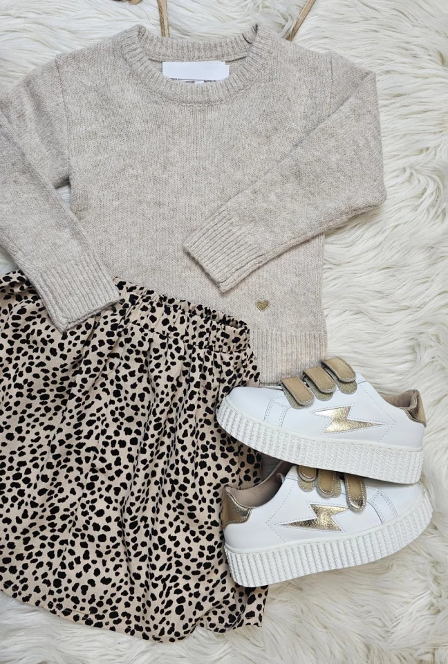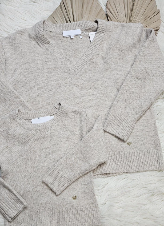 Pull enfant en maille beige avec broderie cœur. Adoptez les looks matchy-matchy pour toute la famille !