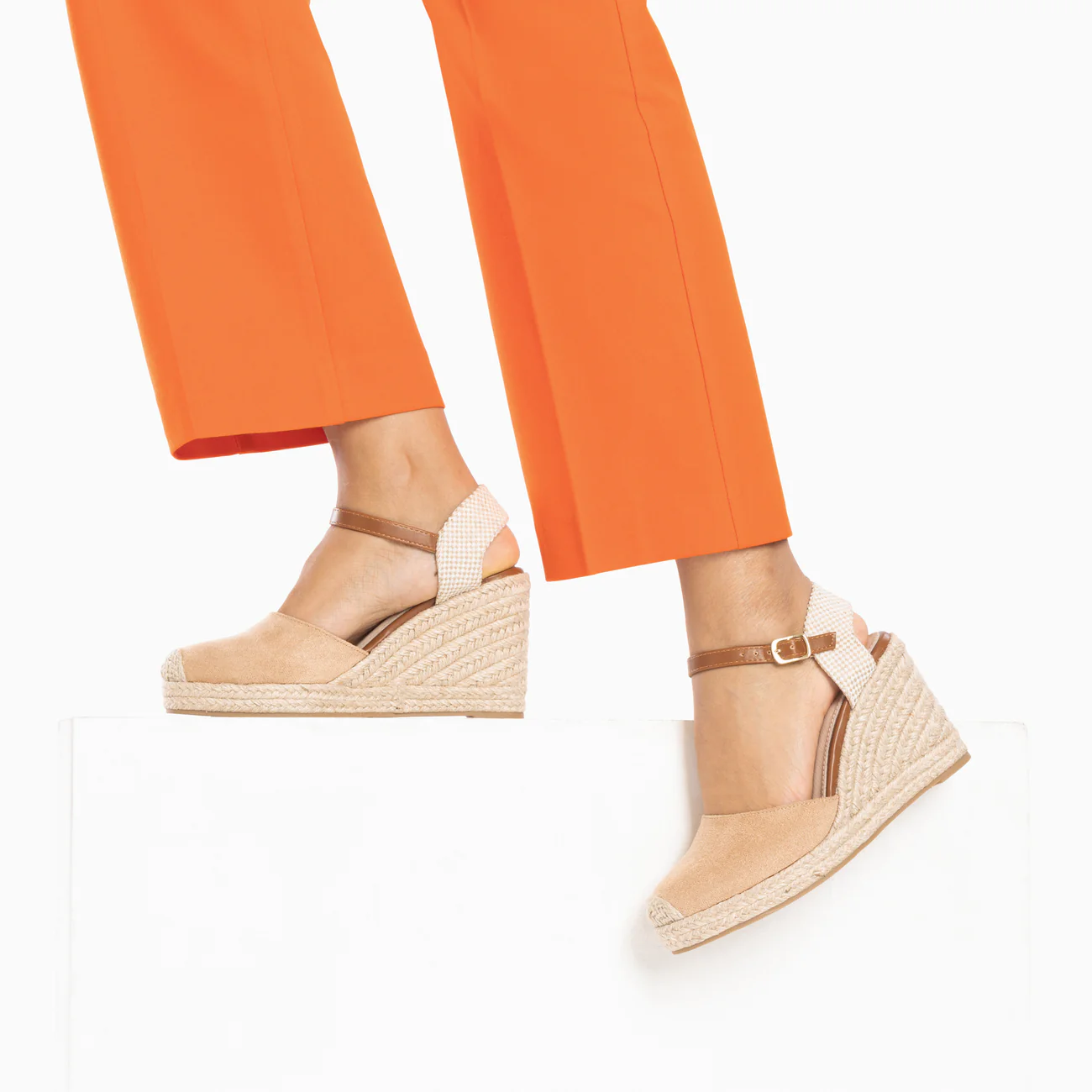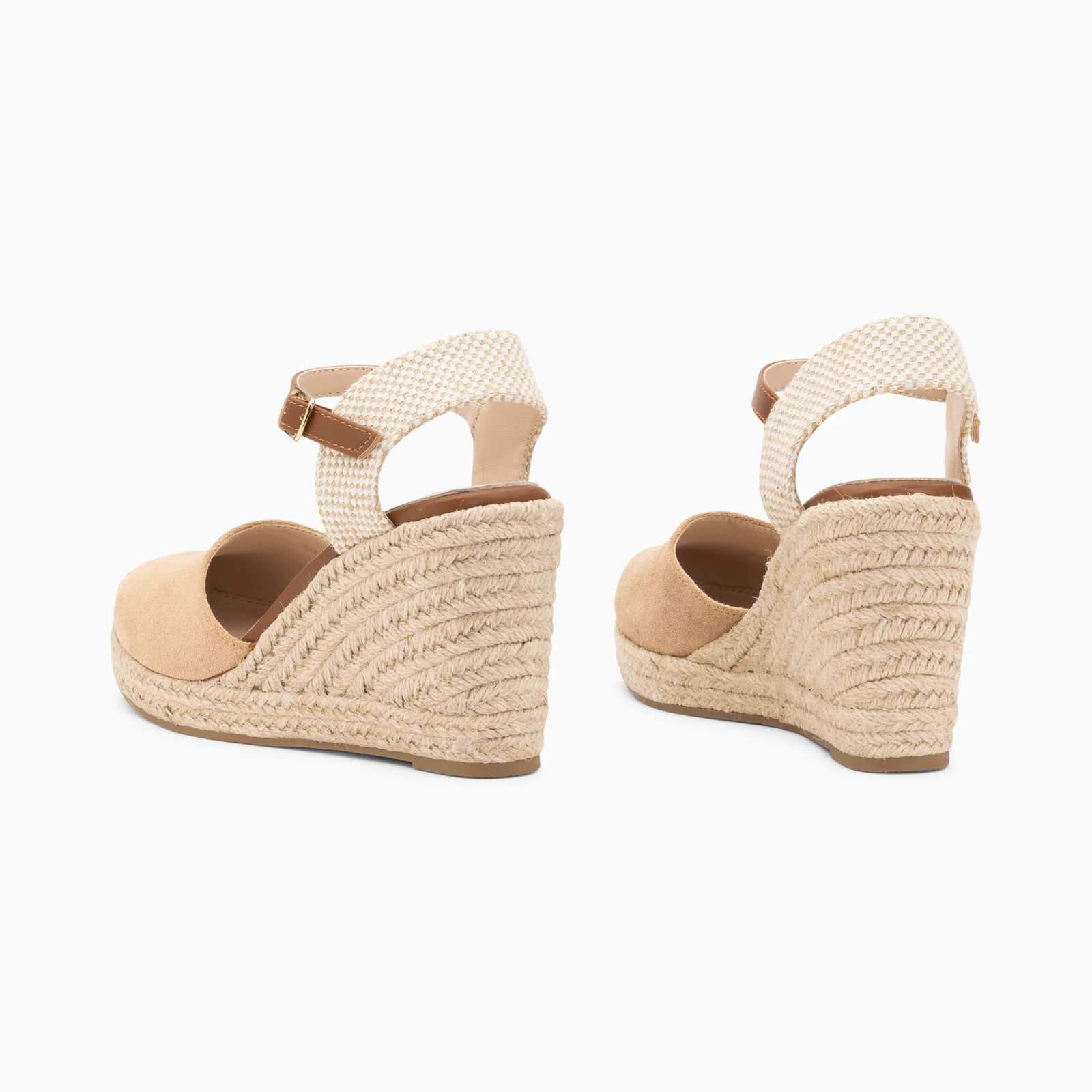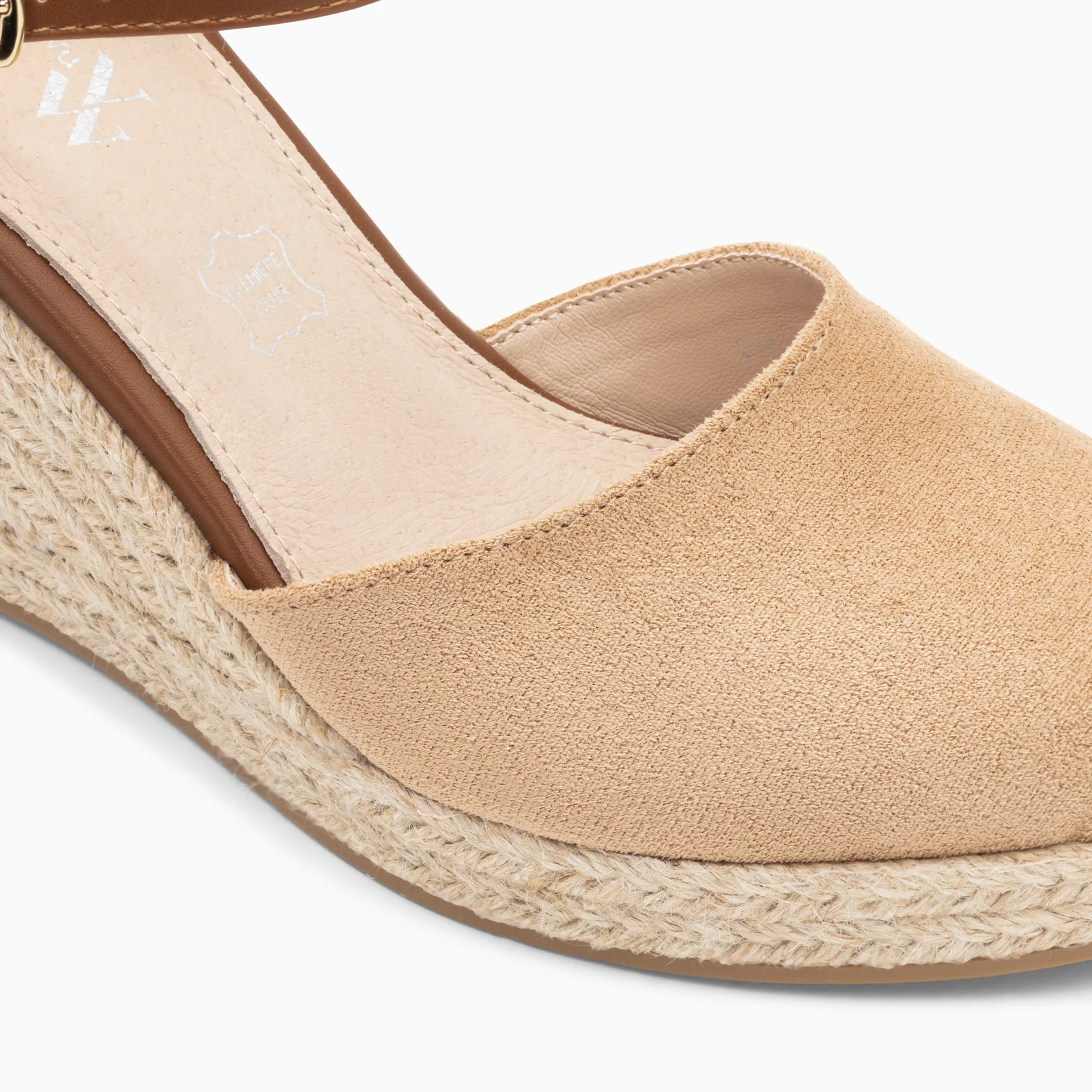 Sandales en suédine beige – Contrefort effet tweed – Bride de cheville réglable en similicuir camel – Fermeture à boucle dorée – Bout en amande renforcé par un empiècement en corde tressée beige – Semelle compensée en corde Hauteur du talon : 10 cm Hauteur de la plateforme : 3 cm Ce modèle taille normalement, prenez votre pointure habituelle. Pour les demi-pointures, préférez la taille du dessous.