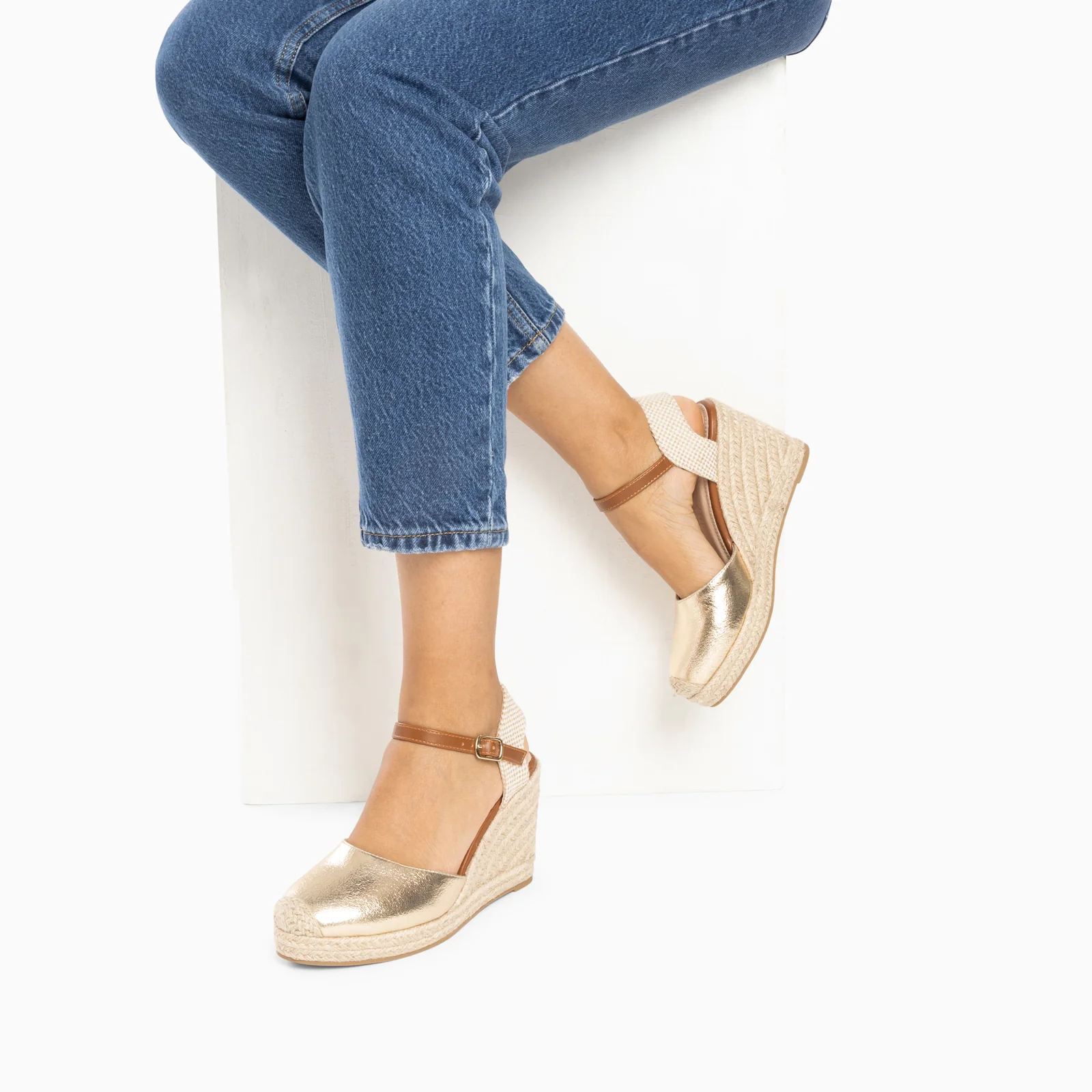 – Sandales en similicuir or texturé – Contrefort effet tweed – Bride de cheville réglable en similicuir camel – Fermeture à boucle dorée – Bout en amande renforcé par un empiècement en corde tressée beige – Semelle compensée en corde Hauteur du talon : 10 cm Hauteur de la plateforme : 3 cm Ce modèle taille normalement, prenez votre pointure habituelle. Pour les demi-pointures, préférez la taille du dessous.