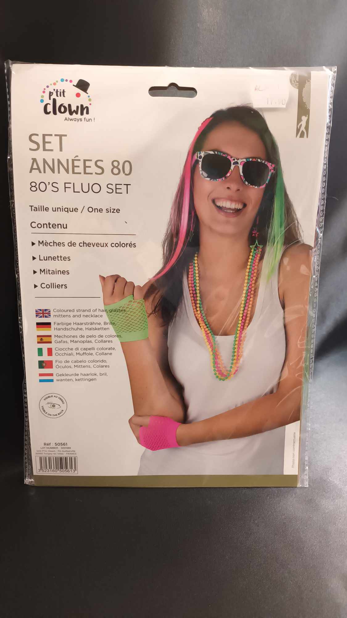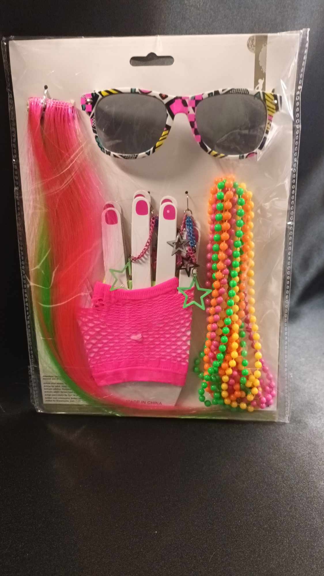Set d’accessoires fluo composé de lunettes, colliers, boucles d’oreille, mitaines résille, mèches de cheveux