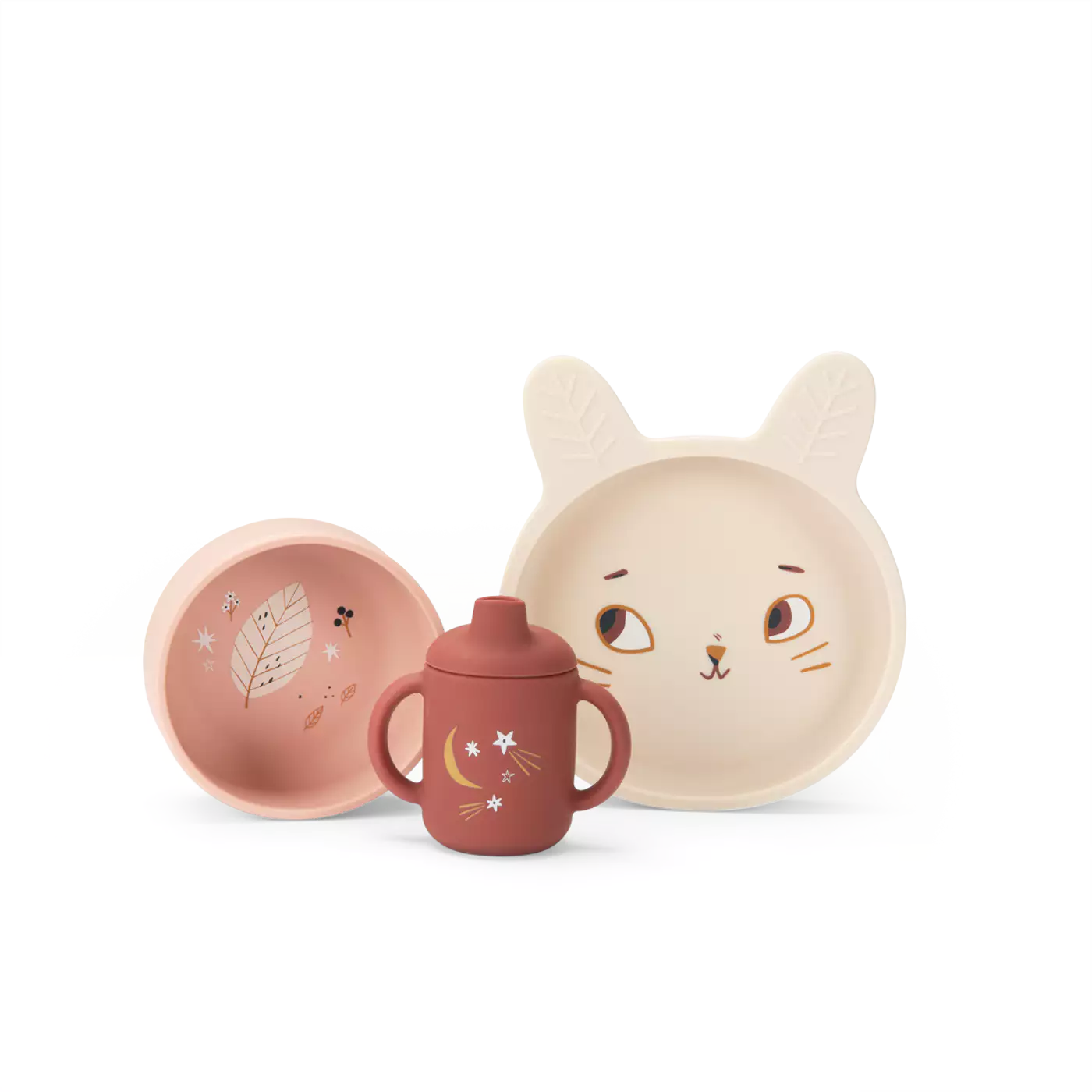 Découvrez le set de vaisselle en silicone de la collection Après la Pluie de Moulin Roty, un coffret vaisselle tendre et ludique, parfait pour accompagner bébé dans l’étape importante de la diversification alimentaire. Le set inclut un bol rose poudré, une tasse à anses terracotta et une assiette en forme de lapin, tous décorés de magnifiques illustrations aux couleurs de la collection. Conçu en silicone, ce set est à la fois facile à nettoyer, incassable et idéal pour les petites mains de bébé, tout en rendant les repas plus amusants. Ce set de vaisselle est une belle idée de cadeau de naissance, qui accompagnera l’enfant dans ses premiers repas.