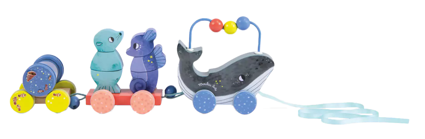 Découvrez le train d’activités à tirer de la collection Les aventures de Paulie de Moulin Roty, un jouet d’éveil en bois que votre bébé va s’amuser à promener dans toute la maison dès ses premiers pas. Bloup, bloup, sous l’océan la baleine fait danser dans son sillon ses amis, l’otarie et l’hippocampe. Un magnifique train d’activités en bois 2 en 1, à la fois empilable et jouet à tirer qui comprend 1 locomotive et 2 wagons détachables avec lesquels bébé pourra s’amuser.
