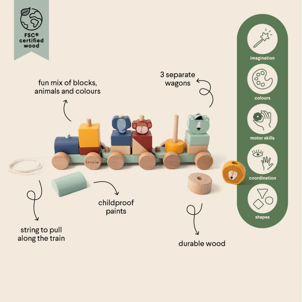 C’est l’heure du départ avec nos amis animaux ! Avec tous les blocs de couleurs variées, les enfants peuvent créer leurs propres wagons. Et la cordelette à l’avant permet de promener le train pour de belles aventures ! Le train et ses éléments sont fabriqués en bois 100% certifié FSC. Toutes les peintures utilisées sont à base d’eau, sans danger pour les enfants et non toxiques.
