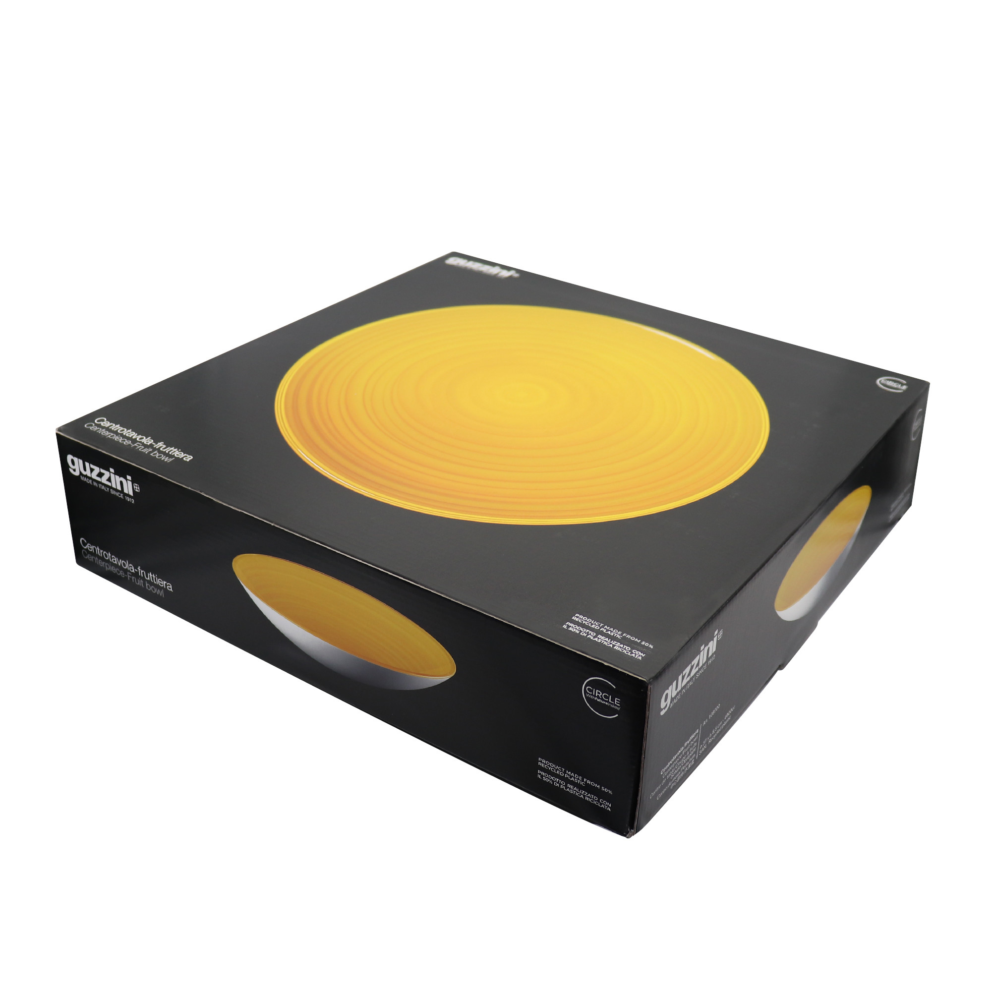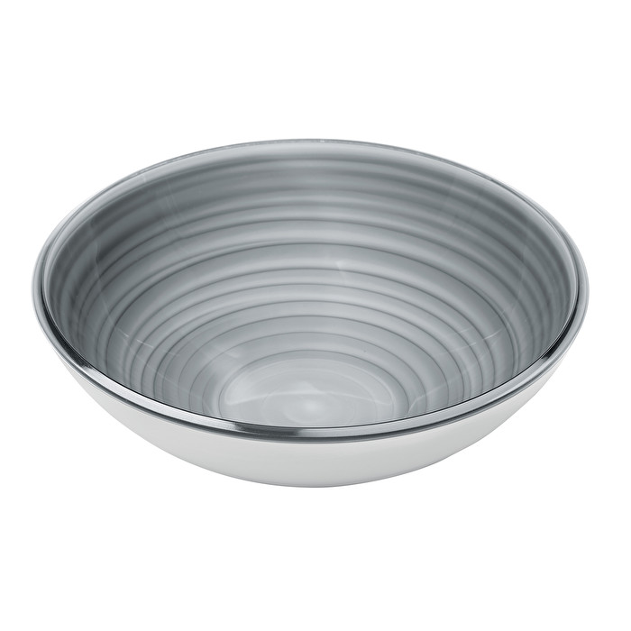 Récipient blanc à l’extérieur et coloré à l’intérieur, dont le graphisme joue avec des cercles concentriques pour procurer une sensation de mouvement et produire effet d’optique agréable. Issu de l’alliance entre un matériau 100% recyclé et un matériau acrylique noble. Capacité 360cc.